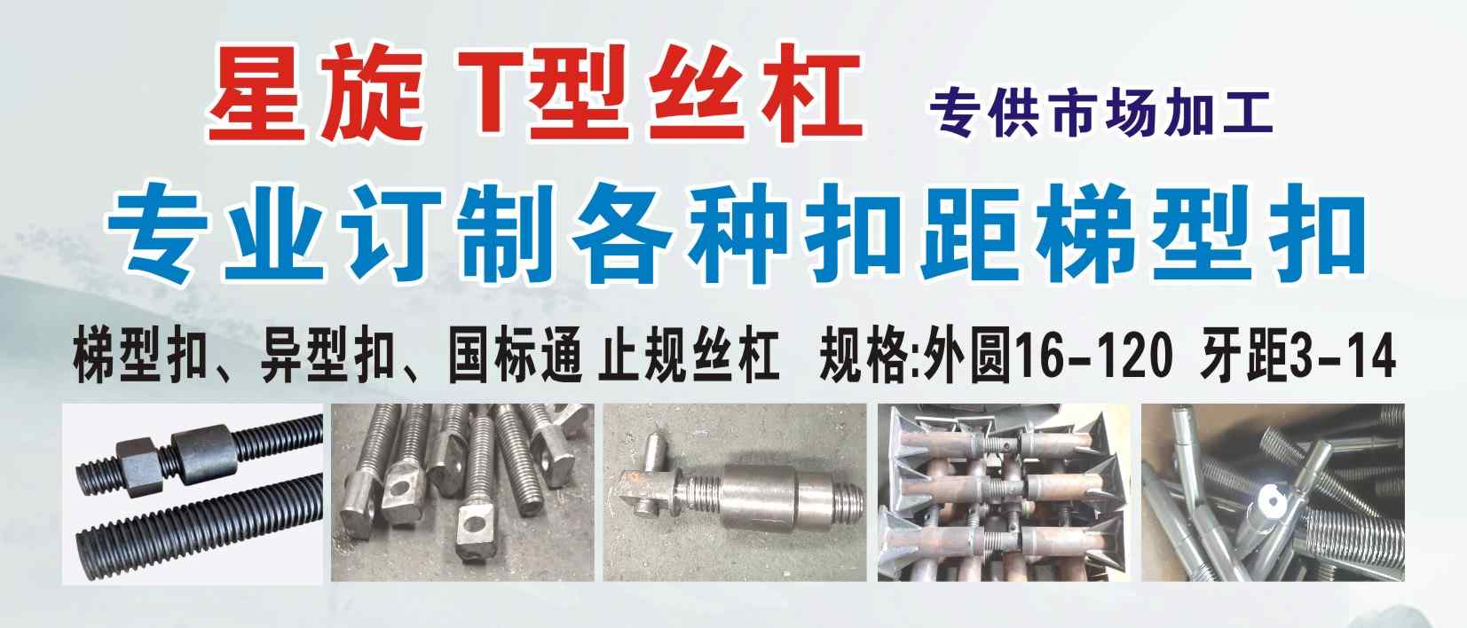 • 梯型扣规格(外圆10-120牙具2-14)、木螺纹扣 PC钩头丝杆、斜支撑丝杆、国标通止规丝杆、反扣等特大异型丝杆