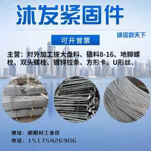 • 你好我是久明紧固件,本厂生产:现货双头16到20的,地栓 拉条 斜拉 单头丝 U型丝 方型卡 现货U型抱箍 瓦钩丝 拉线棒 钢板剪切 热打异形螺丝,中部成型异形螺丝,异形件仿形加工 高强度螺丝 螺母 来图来样定做各种,有需要请联系15231039186《同微信号》15631060342,本公司网站http://https://hdjmjgj.1688.co欢迎新老顾客,我厂竭诚为您服务联系电话15231039186
