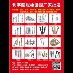 主要生产M6-30纯标膨胀栓,国标膨胀螺丝,加长加大膨胀栓,热水器钩,管卡,托卡,避雷卡,羊眼圈,羊眼钩,吊扇钩,暖气托钩,膨胀钩所有型号都有现货,专供市场调货