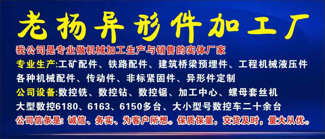 我公司是专业做机械加工生产与销售的实体厂家 主要生产:工矿配件,铁路备件,建筑桥梁預埋件,工程机械液压件,各种机械配件、传动件、非标紧固件,异形件定制。 公司设备:数控铣、数控钻、数控锯、加工中心、螺母套丝机、大型数控6180、6163、6150多台,大小型号数控车二十余台 公司信条是: 诚信,务实、为客户所想。保质保量,交货及时多,量大从优。 欢迎各界人士合作洽谈