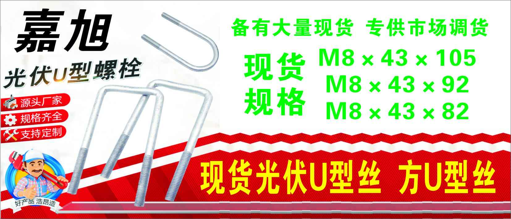 邯郸市展耀紧固件制造有限公司 ①现货地脚螺栓 M12-36现货7字地脚 M16-30现货9字地脚 ②现货方U型丝 现货方卡M16、18、20,高度350-550,中心距离120-170,配套压板及皮套! ③现货钩头螺栓 瓦钩丝 10×80-150 12×100-180 14×100-200 16×100-200 规格齐全,保质保量! 其他规格,均可定做! ④专业加工:地脚螺栓、地笼、拉线棒、平台螺栓、拉杆、方/圆U型丝、压板、高强双头、拉条、梯形扣、预埋件、吊钩、拉环、全扣等、订做各种异形件! 欢迎新老客户来图来样来料加工订购![庆祝][庆祝][庆祝] 电话0310-6891671 手机/微信13930063612 15531030650