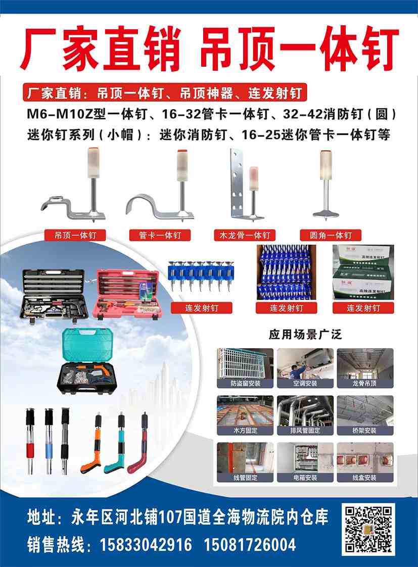 厂家直销: 吊顶一体钉、吊顶神器、连发射钉M6-M10Z型一体钉、16-32管卡一体钉、32-42消防钉(圆)迷你钉系列(小帽):迷你消防钉、16-25迷你管卡一体钉等 专供市场调货