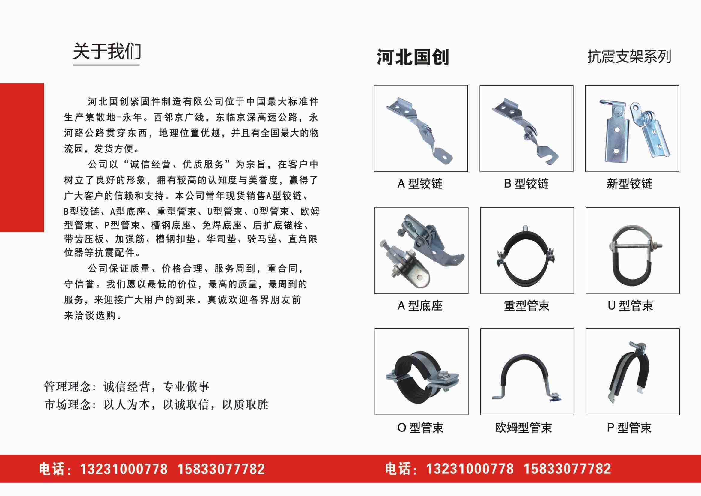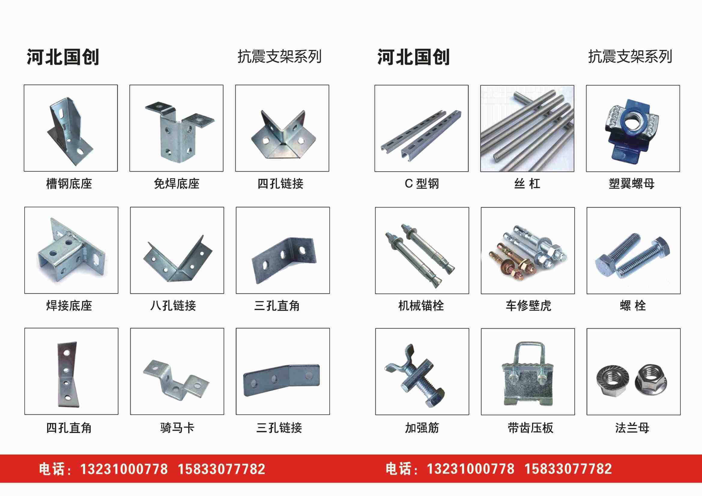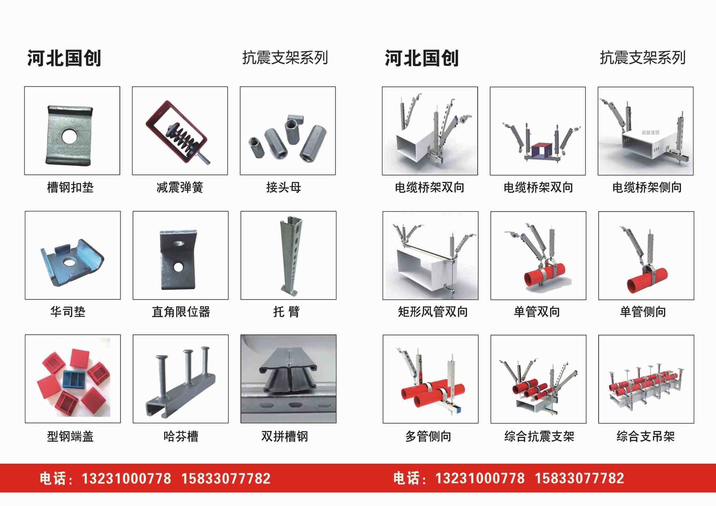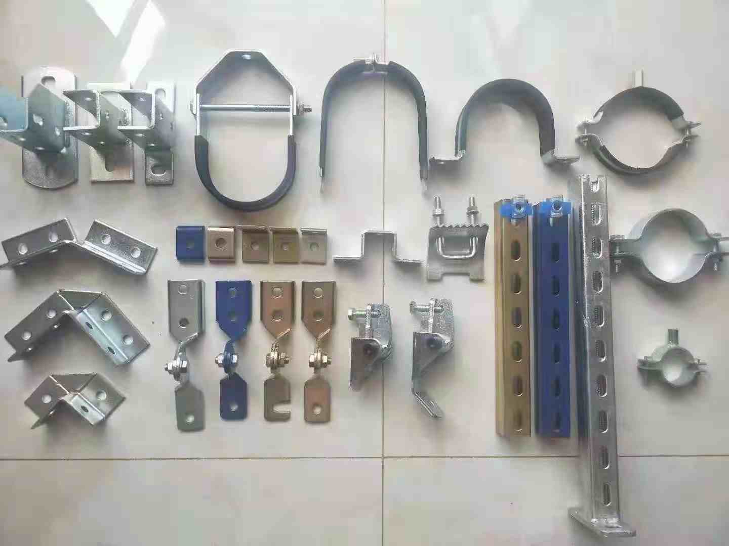 B型铰链、A型底座、重型管束、U型管束、0型管束、欧姆型管束、P型管束、槽钢底座、免焊底座、后扩底锚栓、带齿压板、加强筋、槽钢扣垫、华司垫、骑马垫、直角限位器等抗震配件。