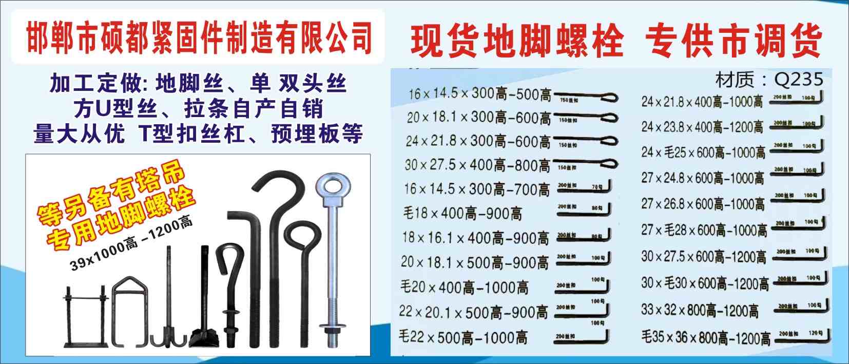 地脚丝,单 双头丝,方U型丝,拉条\自产自销,量大从优T型扣丝杠,预埋板等 另备有塔吊专用地脚螺栓材质:Q355B 39x1000高-1200高