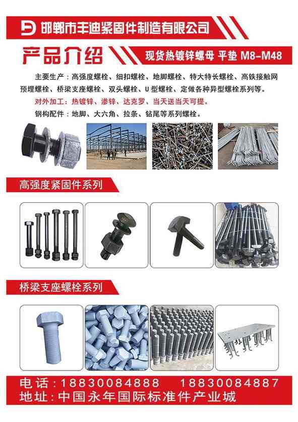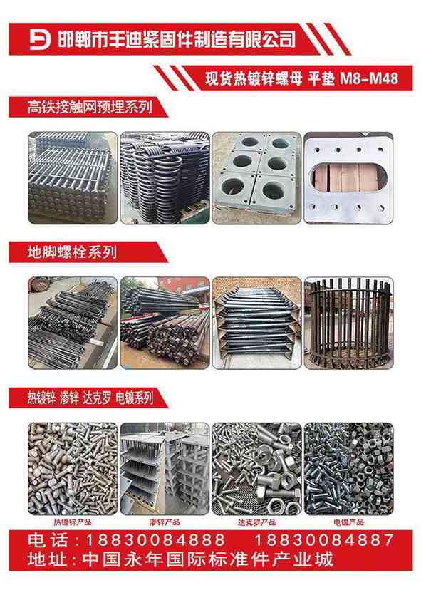定做各种异型螺栓螺母、主产高铁桥梁预埋件系列、接触网预埋螺栓、声屁障预埋螺栓、桥梁支座螺栓、预埋钢板、防落梁挡块螺栓、链接套筒、梁场T梁支撑、金属制品、机械设备加工、对外加工热镀锌防腐、多元合金共渗防腐、现货高强度螺栓、钢结构配件螺栓、镀锌螺栓、膨胀螺栓、不锈钢螺栓等紧固件系列