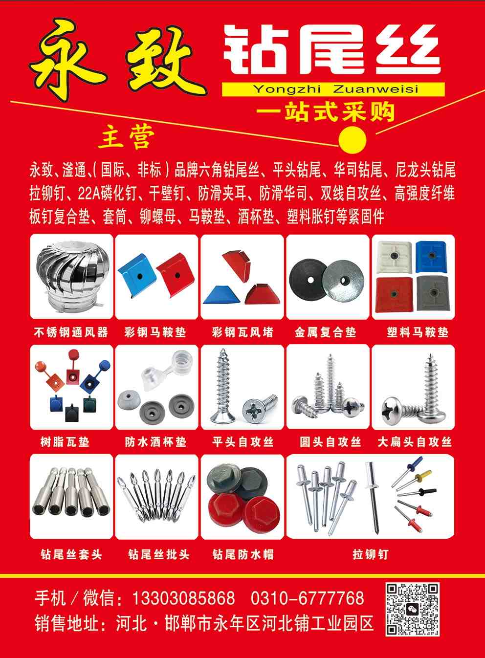 永致 滏通钻尾丝 拉铆钉(国标非标 烤漆 沉头 封闭 全铁)不锈钢钻尾丝 尼龙头钻尾 5号尾 华司钻尾 沉头钻尾 干壁钉 自攻丝 高强度纤维钉 膨胀栓等产品。