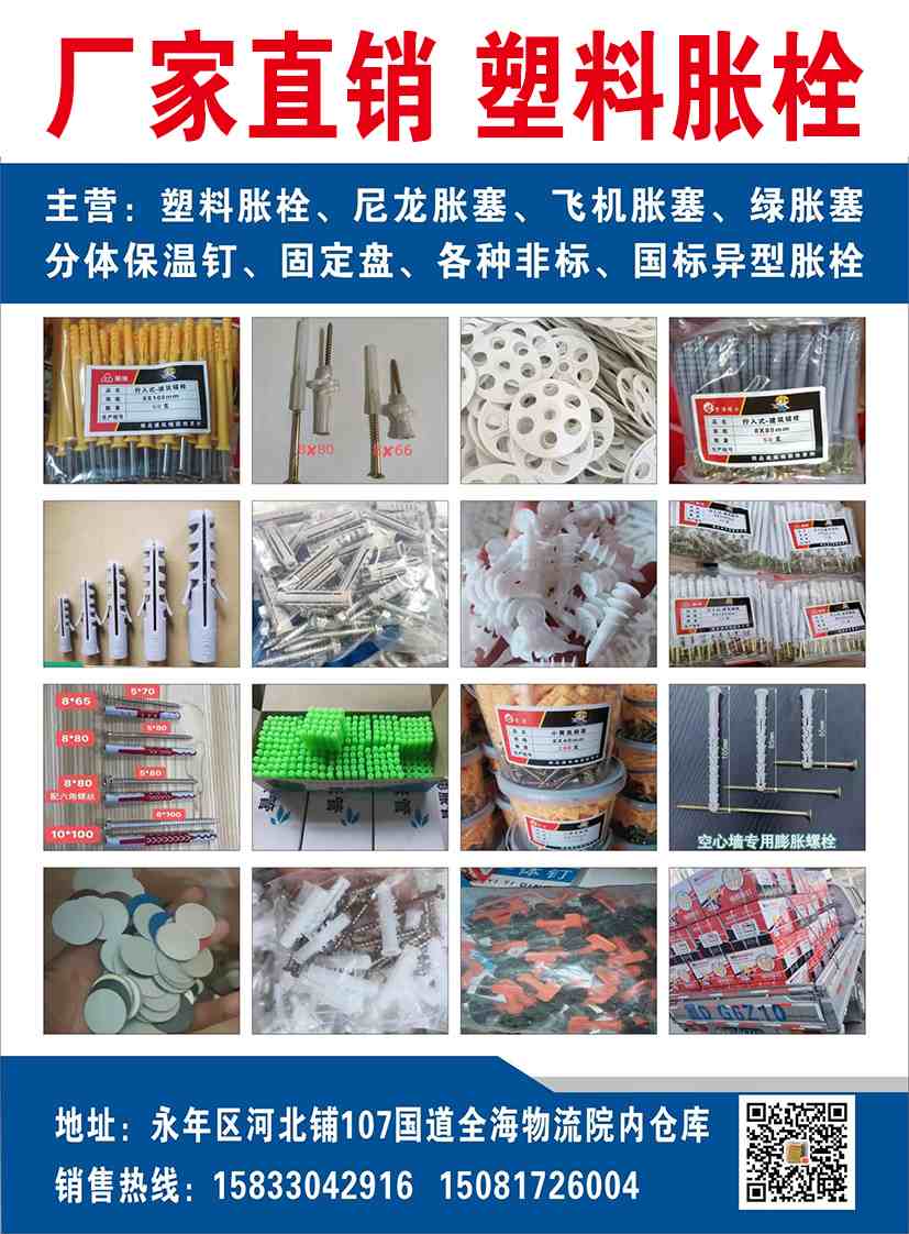 主营:塑料胀栓、吊顶一体钉、保温钉、磷化干壁钉、平头钻尾、华司钻尾、高强度纤维板钉,塑料胀钉.塑料胀栓\塑料胀栓、小黄鱼系列、保温钉系列 塑料胀栓、小黄鱼、保温钉、不锈钢胀钉、保温钉、锚固胀栓、胶膨胀、塑料栓、锚固胀钉、专供市场调货,规格齐全,发货及时