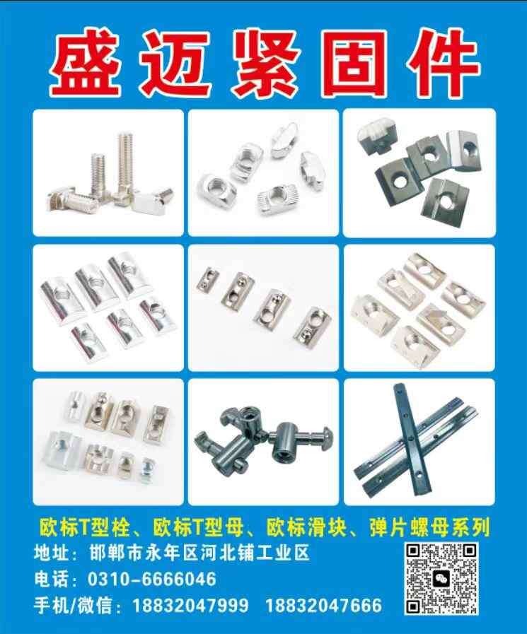主营:调节器T型螺栓、欧标T型螺栓、国标T型螺栓、欧标滑块螺母、国标滑块螺母、欧标T型螺母、国标T型螺母、欧标弹片螺母、国标弹片螺母、欧标弹性螺母、国标弹性螺母、欧标半圆螺母、一字连接件、调节器T型螺栓