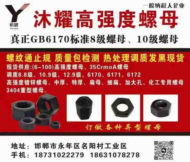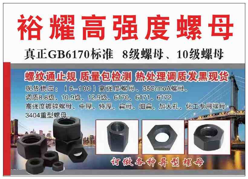 主营:现货供应:(6-100)高强度螺母、35CrmoA螺母、调质8.8级、10.9级、12.9级、6170/6171/6172、高强度镀锌螺母、中厚、特厚、扁母、细扁、加大孔、化工专用螺母、3404重型螺母等 订做各种异型螺母 真正GB6170标准 8级螺母、10级螺母 螺纹通止规 质量包检测 热处理调质发黑现货