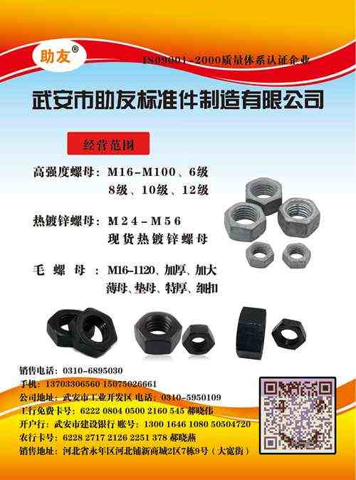 主营:高强度螺母:M6-M100、6级、8级、10级、12级 热镀锌螺母:M24-M56、现货热镀锌螺母 毛螺母:M16-M120 加厚、加大、薄母、垫母、特厚、细扣