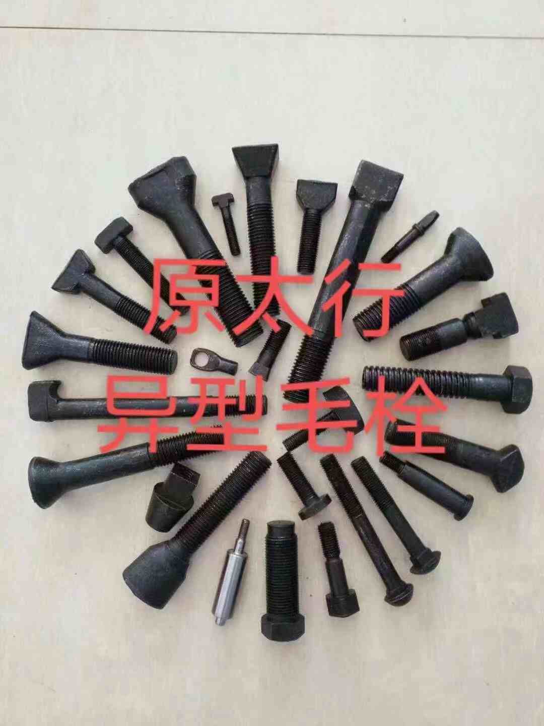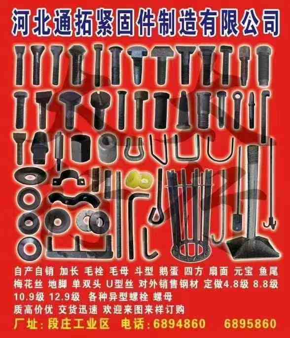 主营:主营 A、专业生产各种地脚螺栓、毛栓、毛母、8.8、10.9、12.9高强度六角螺栓 B、鹅蛋丝、斗型丝、扇面、四方、鱼尾、元宝、单头、双头、T型、活节; C、专业生产铁矿、煤矿、钢厂、球磨机、选矿厂、配件、配套异型栓(备有现货D、订做各种奇、特、难异型件;高强度异型件、异型螺母