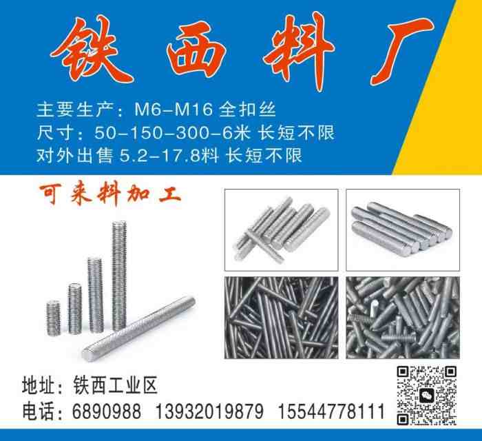主营:M6-M16 全扣丝尺寸: 50-150-300-6米 长短不限 对外出售 5.2-17.8料 长短不限,可来料加工