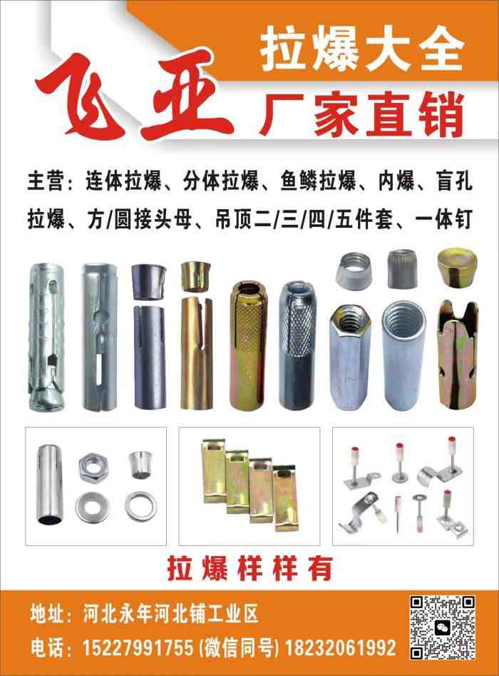 连体拉爆、分体拉爆、鱼鳞拉爆、内爆、盲孔拉爆、方/圆接头母、吊顶二/三/四/五件套、一体钉